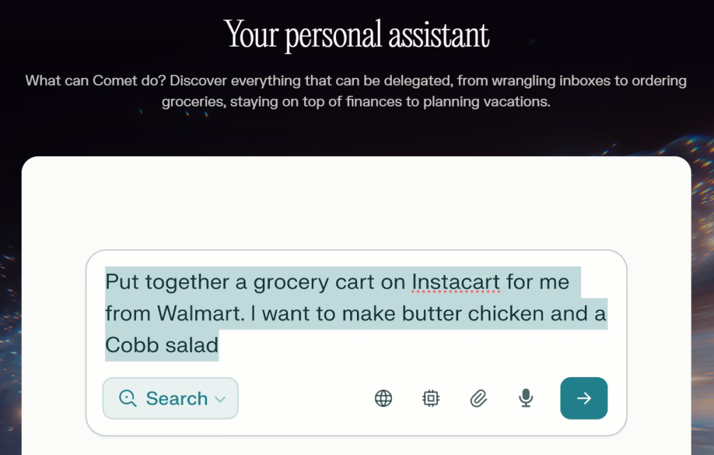 - Task Automation and Workflows: Comet is an Agentic Browser—meaning it can act on your behalf. Ask it to compare products across multiple sites, draft emails based on an article you just read, organize your tabs by topic, or even summarize your past meeting notes. It handles complex, multi-step tasks so you don’t have to.